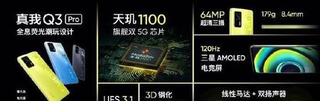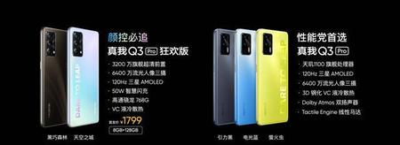 Realme Q3 Pro,采用天玑1100处理器,6.43英寸120Hz高刷AMOLED屏幕,前置16MP摄像头,后置三摄,64MP主摄+8MP超广角+2MP微距,4500mAh电池,30W快充,6+128GB,8+128GB,8+256GB,分别1499,1599和1799。