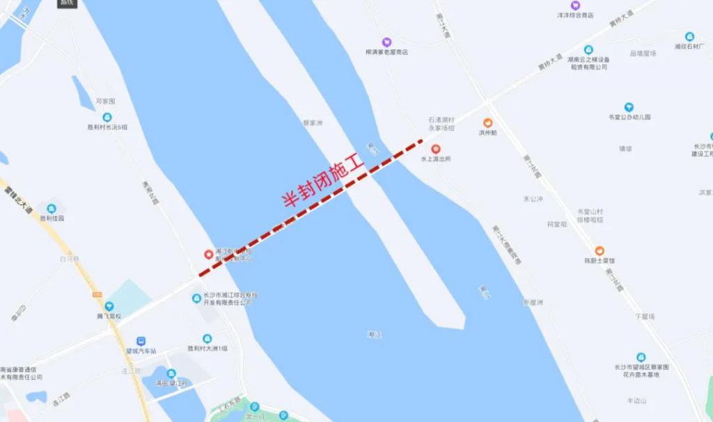 为确保长沙市望城区湘江航电枢纽大桥(湘江大道 - 潇湘北路)提质改造工程能安全、顺利、快速进行施工,依据《中华人民共和国道路交通安全法》第三十九条规定,决定对湘江航电枢纽大桥(湘江大道 - 潇湘北路)路段实行半封闭道路施工。