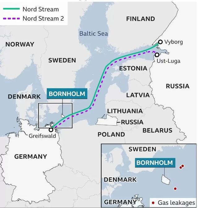 上图是英国广播公司(BBC)12 日制作的一张示意图,图中绿色管道是 " 北溪 -1",紫色虚线管道是 " 北溪 -2",小图是上个月底管道被破坏渗漏的位置。