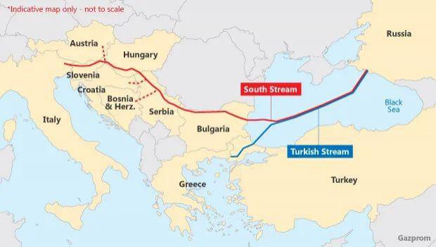 这张示意图上,红线是半路停工的 " 南溪 " 项目,蓝线是已经建成的 " 土耳其溪 "。仅在示意图上直观地观察这两个项目,就会发现在 " 土耳其溪 " 输送俄罗斯天然气的范围,要比当年计划的 " 南溪 " 小得多。