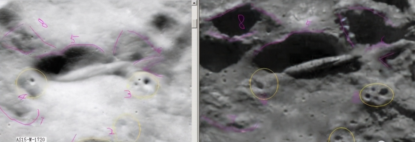 如果各位能用GOOGLE Earth的话,切到月球模式,然后在上述红圈处放大,仔细寻找就能找到大致如下图的样式,当然在GOOGLE MOON地图上因为阴影的关系没那么清晰,不过各位看下图就行!