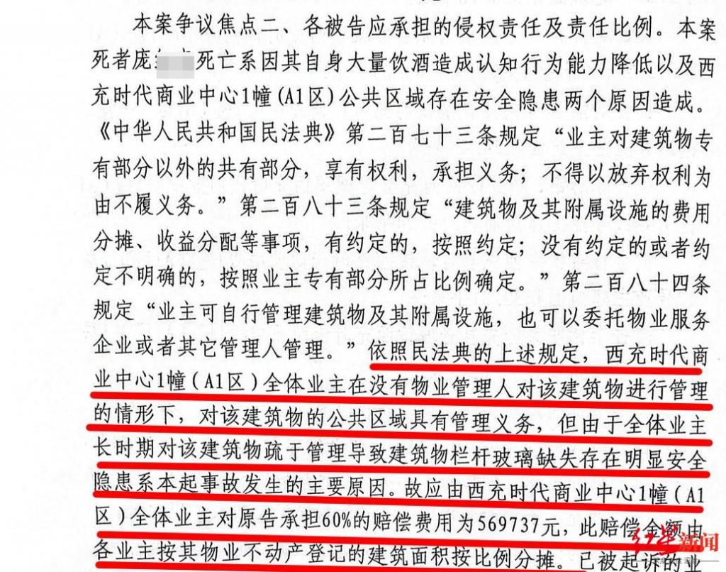 日前,西充县人民法院作出一审判决,当晚共同饮酒人员以及护送者各赔偿 8632 元,87 户业主按物业建筑面积比例各承担数百元到上万元不等的赔偿。