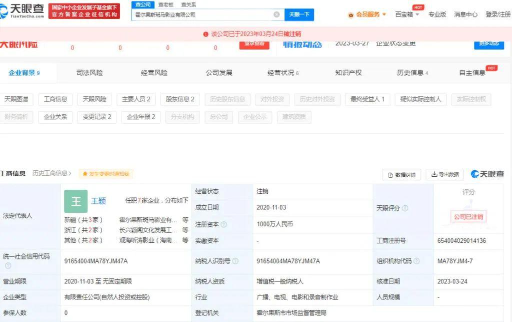 据某查查 APP 显示,近日,演员刘涛持股的霍尔果斯斑马影业有限公司经营状态从 " 存续 " 变更为 " 注销 ",刘涛持股 80%。