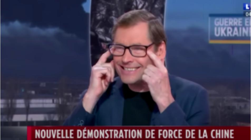 15 日,LCI 邀请嘉宾日尔诺夫谈论台湾局势问题。当节目主持人罗什宾介绍日尔诺夫时,后者一边模仿中国人用 " 你好 " 打招呼,一边笑着用双手拉起两只眼角。看到此情景,主持人罗什宾也笑了。不过,这个场面没有逃过观众的眼睛。该视频经社交媒体转发,被越来越多的人看到。