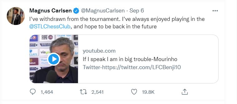 卡尔森赛后立即宣布退出整个辛克菲尔杯赛事,放弃了 10 万美元的奖金争夺。这是他职业生涯第一次放弃比赛,也非常不符合职业棋手的行为常规。卡尔森没有给出任何解释,但在推特上转发了足球教练穆里尼奥抗议比赛结果的 " 名场面 " 视频:如果我说话,我就会有非常大的麻烦。