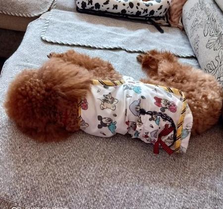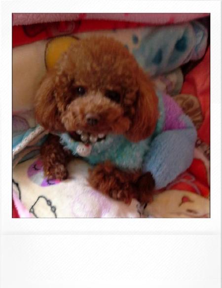 高兴的是这个小朋友非常温顺,半岁以前从来不会乱叫,一个星期就学会上卫生间了,只是他很怕冷,出去遛狗吹着冷风回来就呕吐。晩上睡觉在狗窝里还要盖上他的小被子,保暖不好他也会生病,具体表现在是没胃口,不吃饭。抱着他听得见小肚子叽嘿咕噜的响个不停。