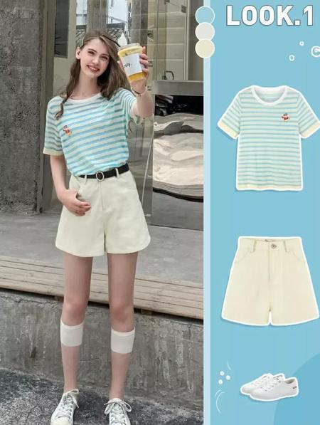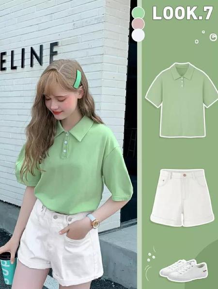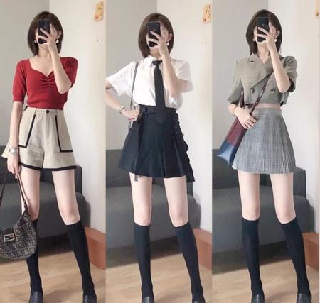 短裙短裤的搭配上,就完全是遵循的高腰法则,不过如果你的腿部条件没有那么细,无论是裤装还是裙装都比较推荐A字版型的,视觉显瘦效果会更好。