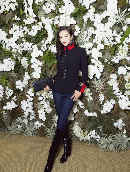 李冰冰黑色夹克搭配黑色漆皮长靴出席活动,帅气军装风