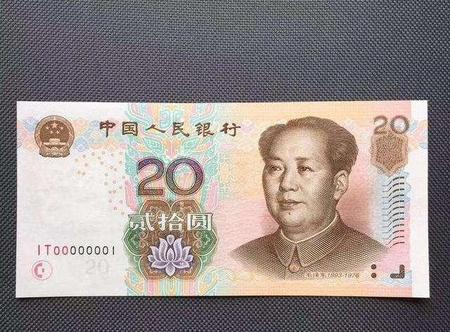 1.开门号、关门号:通俗来讲,就是一套钱币印刷的第一张和最后一张。比如,开门号是第一号00000001,关门号就是第一亿号100000000。这个价格也很贵,和8同不相上下。下图为20元的开门号。