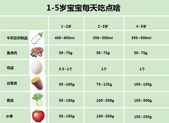 1岁以内的宝宝主要靠母乳或者配方奶来提供营养。6个月以后的宝宝可以逐渐添加辅食。1岁到5岁的孩子可以按照上表的食物搭配来进行。