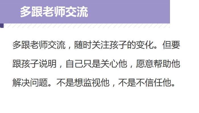 专家支招:家长首先要改变自己的沟通方式。“孩子很多时候抗拒的不是家长的沟通内容,而是家长高高在上的沟通态度。”,沟通的效果不取决于家长到底说了多少,而是取决于孩子听进去了多少。因此,这个阶段的家长一定要少言、慎言、多听、多看。