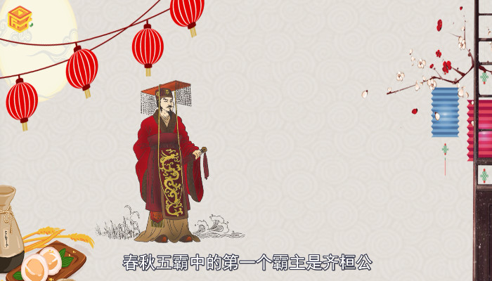 春秋五霸中的第一个霸主是齐桓公。齐桓公,姜姓,吕氏,名小白。他被称为姜小白、吕小白或是公子小白,他是姜太公吕尚的第十二代孙,也是春秋时代齐国第十五位国君。