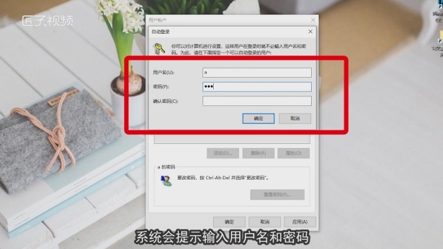 3、系统会提示输入用户名和密码。这个密码就是开机密码,输入2次密码,再点击下方的“确定”就大功告成了。