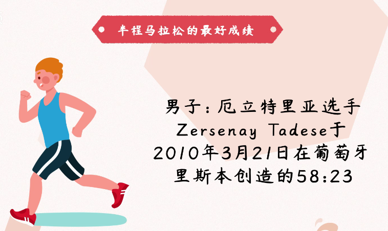 男子:厄立特里亚选手ZersenayTadese于2010年3月21日在葡萄牙里斯本创造的58:23。