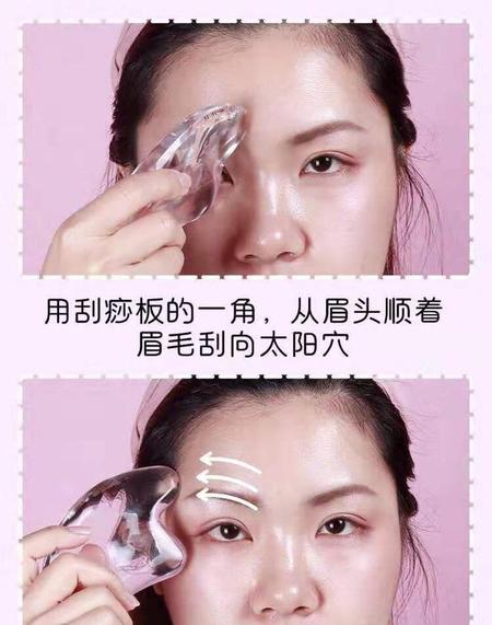 用刮痧板的一角,从眉头顺着眉毛刮向太阳穴
