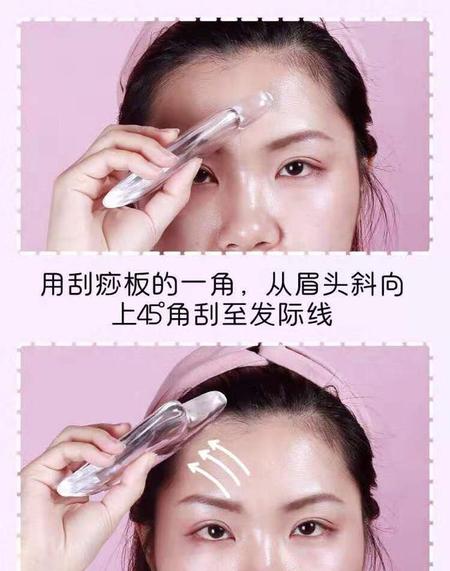 用刮痧板的一角,从眉头斜向上45°角刮至发际线