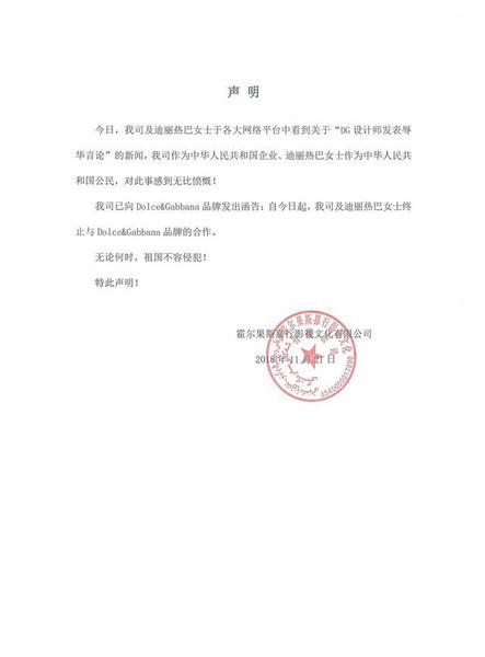 中国明星、模特知道辱华言论后,纷纷退出大秀,作为D&G代言人的迪丽热巴,马上就发布声明,中止了合作。