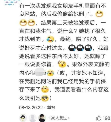 有一次我发现我女朋友手机里面有不良网站,然后我偷偷给她删了,结果第二天被她发现后,一直在和我生气,说什么她找了很久才找到的。最终哄了好久,好说好歹才应付过去。我跟她说看多了这种东西不太好,她就瞟了一眼说要你管。果然外表文静的女孩内心很...