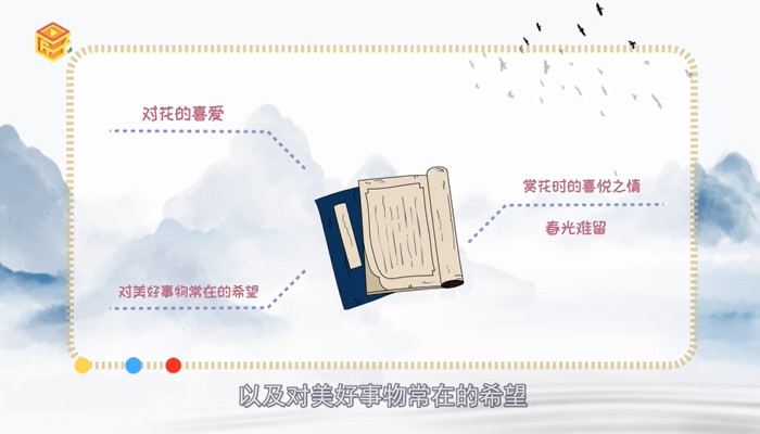 这首诗的意思是:黄四娘家周围的小路旁开满了鲜花,它们把枝条都压得低垂了。蝴蝶在花丛中恋恋不舍地盘旋飞舞,自由自在的小黄莺在花间不断欢唱。