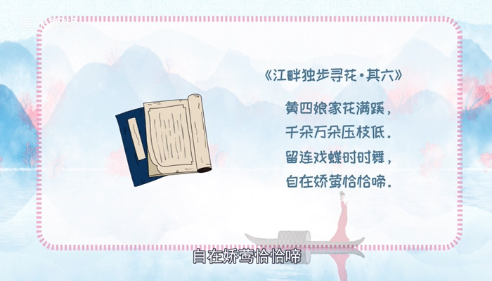 这七首诗中最脍炙人口的是《江畔独步寻花·其六》,这首诗的原文为:黄四娘家花满蹊,千朵万朵压枝低。留连戏蝶时时舞,自在娇莺恰恰啼。