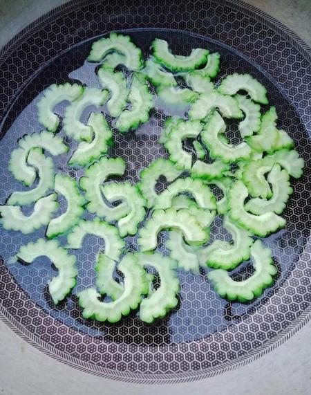 苦瓜洗净、切片,用盐水泡15分钟,
