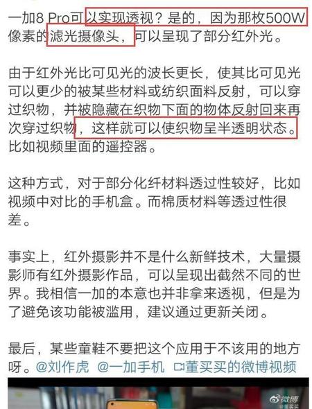一加8的这颗500万像素的滤光镜头,最主要的功能是可以让手机屏幕显示红外光线,红外光的波长更长比较容易穿过衣服的材料,对于某些特定的衣服来说就出现了透视的效果。根据网友的演示,对于某些特定的布料材质,例如尼龙、非纯棉衣料等,塑料纸、部分聚碳酸酯的塑料外壳也可以,一加8的透视效果确实能够出现。