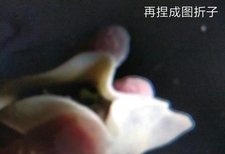 2,准备的饺子皮,按图用可指恣势放入心料,再捏成折子。