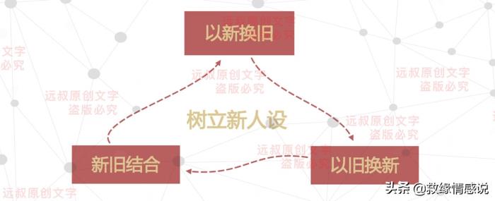 树立新人设的三个步骤是一个循环步骤,主要分为:以新换旧,以旧换新,新旧结合