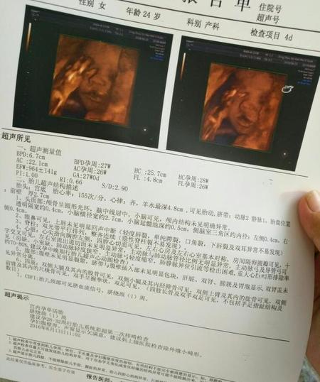 比如彩超单上写着:颅骨光环完整、心脏四腔室可见、鼻骨看见、上唇未见明显中断、脊柱排列整齐。这些都说明胎儿外观是健康的。