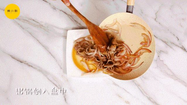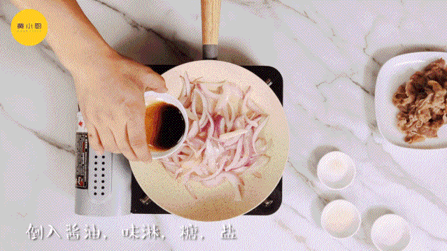 锅中倒油,放入牛饭洋葱牛翻炒间的出牛冻香味后加入酱油食、味淋、糖、盐。