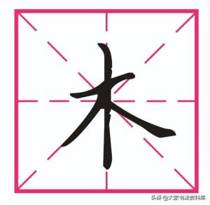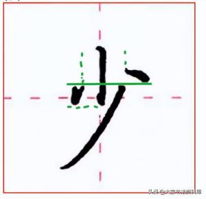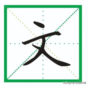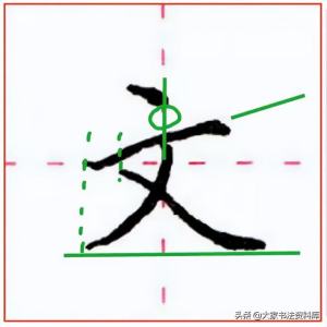 4、横画与竖的交叉右边偏下写斜捺,斜捺带出捺脚,捺收笔位置超过短横的收笔,捺画收笔处要比撇画收笔处高。