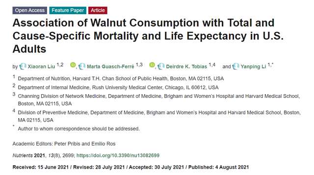 [2]Liu, X.有啥; Guasch-真的Ferré, M.; Tobias, D.K.; Li, Y. Association of Walnut Consumption with Total and Cause-Specific Mortality and Life Expectancy in U.S. Adults. Nutrients 2021, 13, 2699.