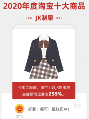 2020年度淘宝十大商品中“JK制服”成交金额同步暴涨255%的事实进一步阐明了“JK制服”实用经济的市场化。
