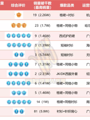 以上例举的33家单件销量破千的品牌所展示出来的特点仍旧围绕:百褶裙、同格小物(主要是领结)、衬衫、西式外套、针织外套、水手服这些品类。