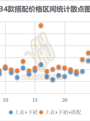 我们仍旧对以上44家品牌的143款畅销品进行分析,如上所列的整套价格区间仅是针对衬衫+百褶裙或者衬衫+百褶裙+其他搭配两种情况,因这两种搭配在日常生活中更为常见。