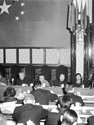 1953年2月11日下午,什么是政治制度文明,中央人民政府委员会在京举行第二十二次会议。邓小平(右一)在会议上作关于中华人民共和国全国人民代表大会及地方各级人民代表大会选举法的说明报告。主席台上(自左起)宋庆龄副主席,毛泽东主席,刘少奇、朱德、李济深、张澜副主席。 新华社发(资料照片)