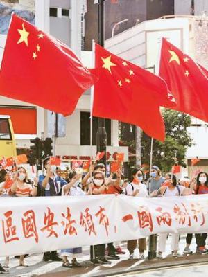 2020年6月30日,十三届全国人大常委会第二十次会议表决通过《中华人民共和国香港特别行政区维护国家安全法》,并决定将该法列入香港基本法附件三,由香港特别行政区在当地公布实施。图为6月30日,香港市民在铜锣湾街头支持实施香港国安法。 新华社记者 王申/摄