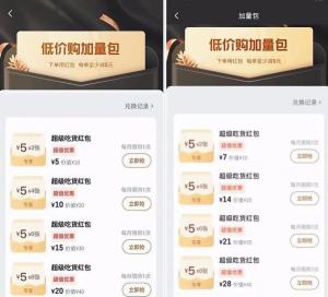 家住北京市海淀区蓝靛厂路的消费者刘宁向记者展示了他的两张外卖会员加量包截图。记者看到这两张截图分别来自两部手机,截取时间相隔几分钟,但上面显示的价格却完全不一样:一张截图显示超级吃货红包为5元、10元、15元、20元,另一张截图显示为7元、14元、21元、28元(见截图↓)。