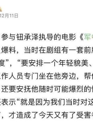 听过一个工作人员爆料,说新闻钮承泽导戏的时候,有一个“小天使制度”。什么是小天使,就是要安排一个年轻貌美新闻的女性专门坐在他旁边,帮他控制荧幕,倒酒,和安抚他随时可能爆烈的情绪。