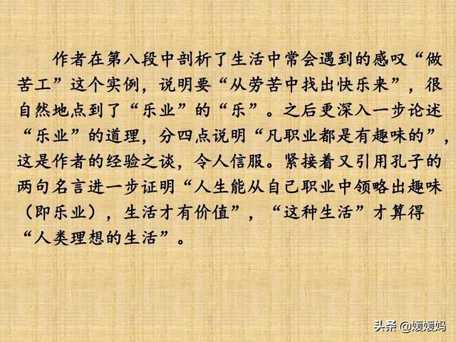 作者在前面剖析了生活中常会遇到的感叹“做工苦”这个实例,说明要从劳苦中找出快乐来,很自然地标点贬义点到了“乐业”的“乐”。本段更深入一步,论述“乐业”的道理,分四点说明“凡职业都是有趣味的”,这是作者的经验之谈,令人信服。紧接着又引用孔子的两句名言进一步证明“人生能从自己职业中领略出趣味”(即“乐业”),生活才有价值,“这种生活”才算得“人类理想的生活”。