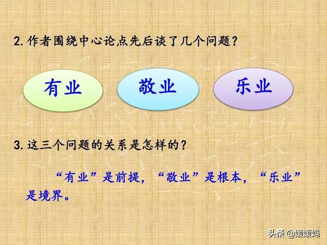 作者先后谈论了“有业”“敬业”“乐业”三个问题。按照“有业”“敬业”“乐业”的顺序分别论述:“有业”是“敬业”“乐业”的前提和基础;“敬业”是对长的职业采取的基本态度;“乐业”是对待职业的更高境界,层层递进,论证严密,思路清晰,使人一目了然。