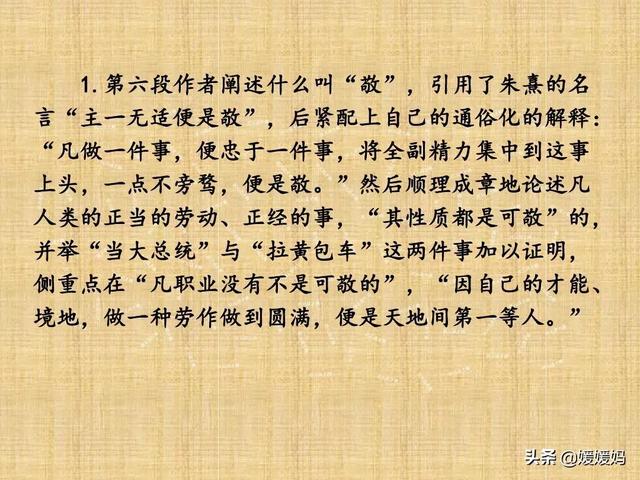 第六段作者阐述什么叫“敬”,引用了朱熹的名言“主一无适便是敬”后,紧配上自己通俗化的解释:“凡做一件事深,便忠于一件事,将全副精力集中到这事上头,一点不旁骛,便是敬。”然后顺理成章地论述凡人类的正当的劳动、正经的事,“其性质都是可敬”的,并举“当大总统”与“拉黄包车”这两件事加以证明,侧重点在“凡职业没有不是可敬的”,因自己的才能、境地,做一种劳作做到圆满,便是天地间第一等人。