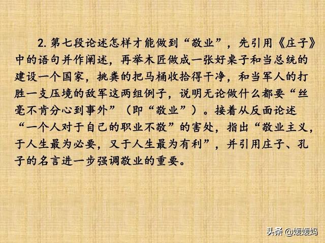 第七段论述怎样才能做到“敬业”,先引 用《庄子》中的语句并做阐述,再举木匠做成一张好桌子和当政治家的建设成一个共和国家,挑粪的把马桶收拾得干净,和当军人的打胜一支压境的敌军这两组例子,说明无论做什么都要“丝毫不肯分