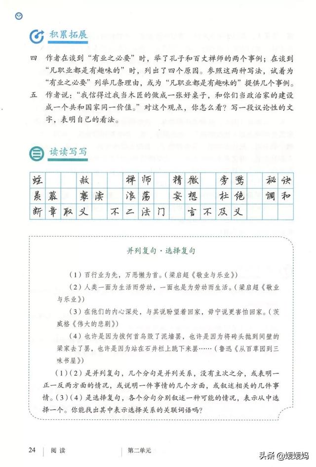 三、如第6段褒义中“业有什么可敬呢?为什么该敬呢?”和第7段“怎样才能把一种劳作做到圆满呢?”采用设问的方式过渡,承接上文论述“敬业”的重要性,开启下文论述如何做到“敬业”。再如第6段“凡职业没有不是神圣的,所以凡职业没有不是可敬的”和第7段“所以敬业主义,于人生最为必要,又于人生最为有利”中,关联词“凡……没有不……”,“所以……”起到总结上文的作用。