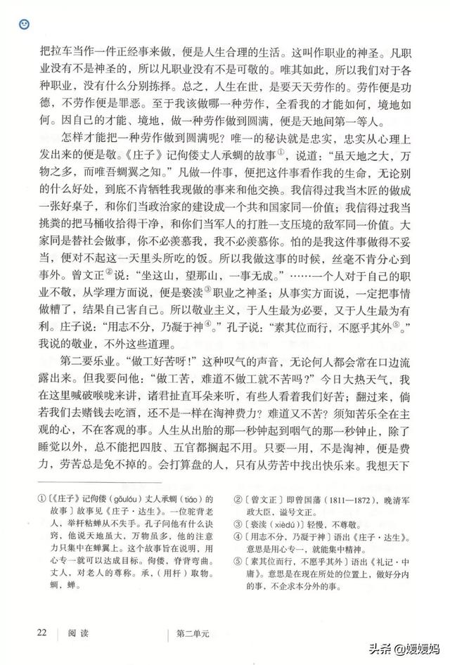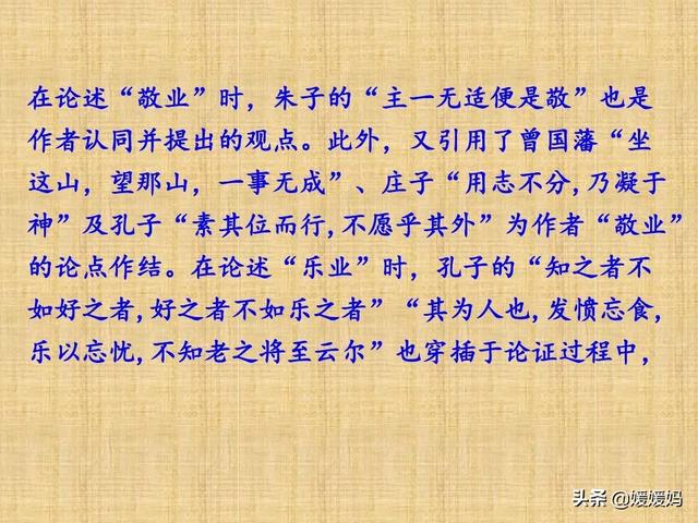 心到事外”(即“敬业”)。接着从反面论述“一个人对于自己的职业不敬”的害处,指出“敬业主义,于人生最为必要,又于人生最为有利”,并引用庄子、孔子的名言,进一步强调“敬业”的重要。举例和引用论证的自然结合使文章的说理立于不败之地。