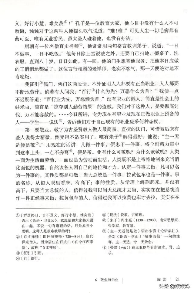 引用孔子的言论证明“敬业乐业”的前提是“有业”。引用百丈禅师的例子有效地说明了人要不断地劳作,从而增强了文章的说服力。