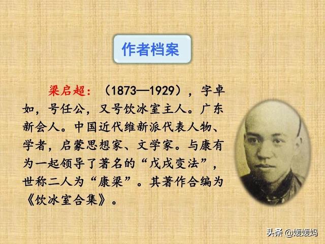 梁启超(1873—1929),字卓如意,号任公,又号饮冰室主人。广东新会人,中国近代维新派代表人物,著名学者。与康有为一起情感领导了著名的“戊戌变法”。曾任《时务报》主笔,其著作编为《饮冰室合集》。