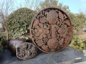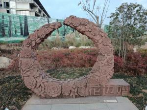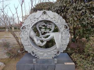 雕塑以牡丹和石榴为主题。牡丹,一直被国人视为富贵、吉祥、幸福、繁荣的象征。从唐代起,牡丹就被推崇为“国色天香”,牡丹统领群芳,地位尊贵;而石榴的籽粒繁多,象征着多子多福的寓意。牡丹和石榴表达了爱情绵延、子孙延续的美好祝愿。