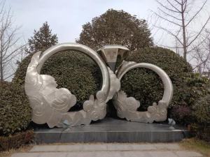夫妻恩爱,琴瑟和谐。雕塑用极具现代感的抽象语言,描绘了一对鸾凤和鸣的神鸟,正振翅欲飞。