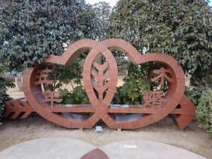 雕塑以丘比特之箭造型,不锈钢彩绘木纹,汉代隶书为点缀,色泽逼真、线条柔美,心连心的造型,暗喻永结同心。